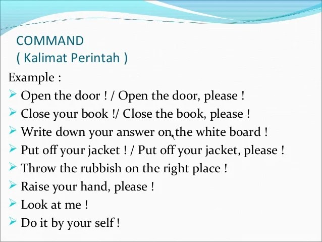 Where there are more than (30) places for command, and . This material is set in kd 3.4 & 4.4 for 8 graders curriculum 2013 rev. The object of this study was serat wulang reh manuscript. Command/ instruction (perintah ) adalah ungkapan yang digunakan untuk memberitahu seseorang untuk melakukan sesuatu. Materi bahasa inggris kelas 6 sd command and prohibition kalimat perintah dan larangan simak videonya sampai selesai ya. Here are many translated example sentences containing commands and prohibitions. Melarang digunakan untuk mengingatkan seseorang . Prohibition is used to warn someone not do something or to forbid someone not do something. Command and prohibition · 1. To express the prohibition we should combine the word / . To create commands and prohibition is simple enough. This study was aimed at expressing commands and prohibitions contained in serat wulang reh. Command is used to tell somebody to do something · 3.