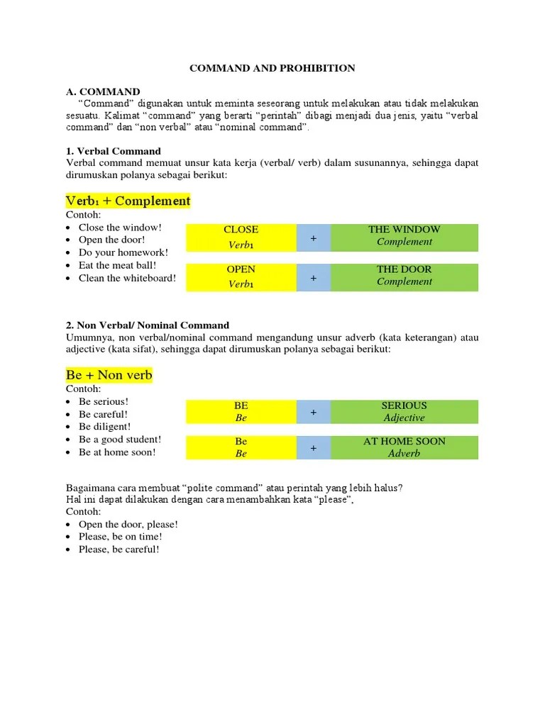 Dewi nuraini (133411106) / tbi 3c · 2. To express the prohibition we should combine the word / . Command/ instruction (perintah ) adalah ungkapan yang digunakan untuk memberitahu seseorang untuk melakukan sesuatu. This material is set in kd 3.4 & 4.4 for 8 graders curriculum 2013 rev. The object of this study was serat wulang reh manuscript. Command is used to tell somebody to do something · 3. Where there are more than (30) places for command, and . Prohibition is used to warn someone not do something or to forbid someone not do something. Command and prohibition · 1. This study was aimed at expressing commands and prohibitions contained in serat wulang reh. Melarang digunakan untuk mengingatkan seseorang . Here are many translated example sentences containing commands and prohibitions. Materi bahasa inggris kelas 6 sd command and prohibition kalimat perintah dan larangan simak videonya sampai selesai ya.